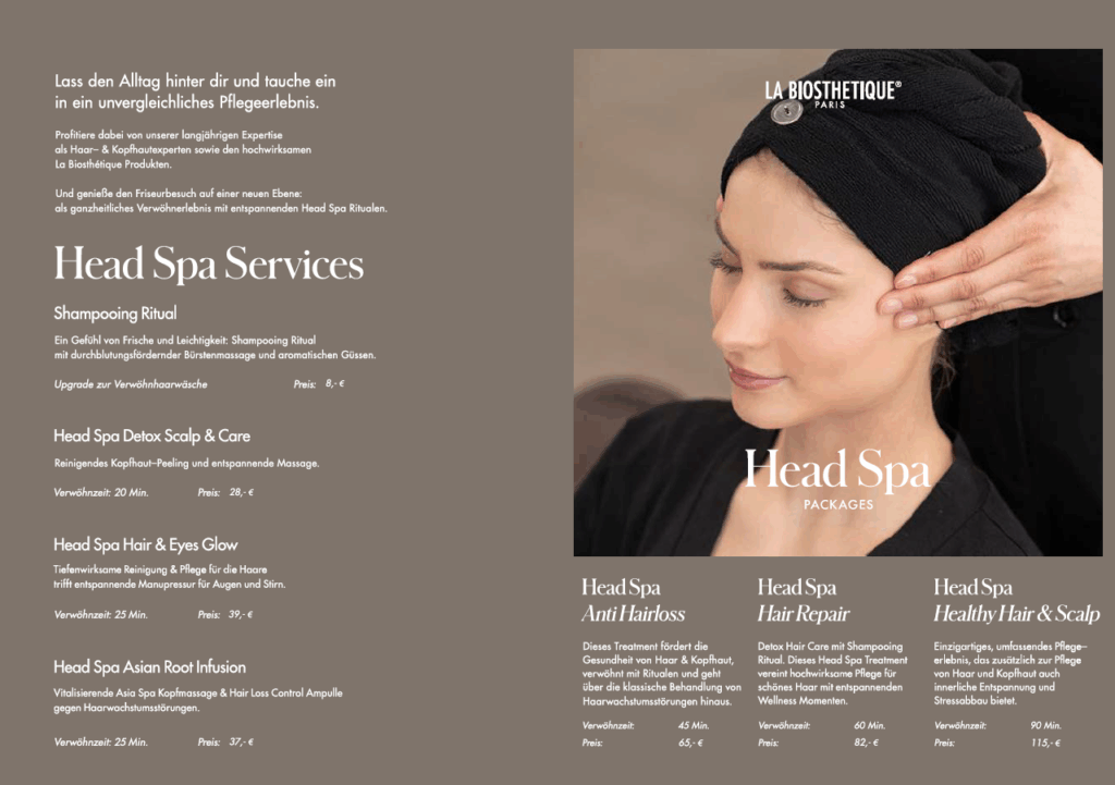 Mit diesen 6 Head Spa Behandlungen bieten Sie Ihnen kurze oder luxuriöse Verwöhn– rituale für Kopfhaut, Haare und Sinne. Sie verbinden professionelle Haar– und Kopfhaut– pflege mit Elementen aus Wellness und Aromatherapie, die nicht nur das Haar stärken, sondern auch das Wohlbefinden steigern.